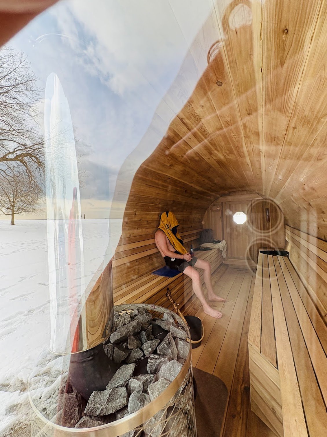 Sauna with community on Saturdays at Montrose Harbor, Mondays at Pulaski Park, and Fridays at Smith Park, February 13th — April 13th.